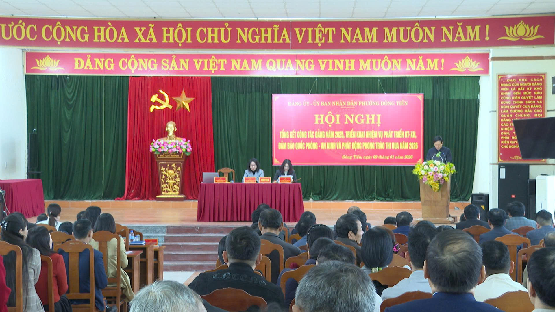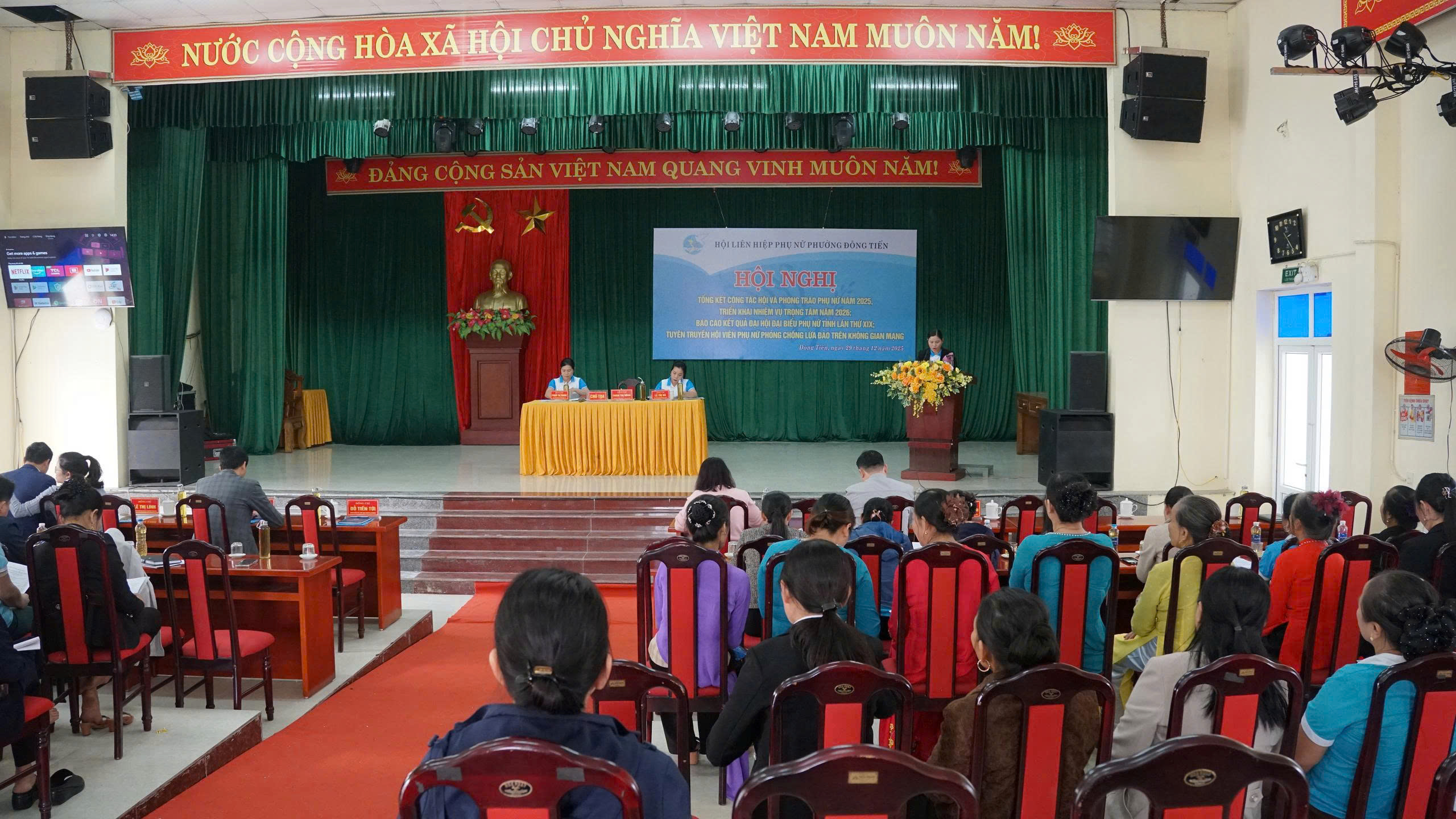 Phát biểu chỉ đạo, đồng chí Nguyễn Thị Thủy ghi nhận và biểu dương những kết quả đạt được của Hội LHPN phường trong năm 2025; đồng thời đề nghị thời gian tới, Hội tiếp tục đổi mới nội dung, phương thức hoạt động; bám sát nhiệm vụ chính trị của địa phương; tăng cường công tác tuyên truyền, nâng cao nhận thức cho hội viên phụ nữ, nhất là chủ động phòng ngừa, đấu tranh với các hành vi lừa đảo trên không gian mạng; phát huy vai trò nòng cốt của phụ nữ trong xây dựng gia đình hạnh phúc, văn minh, góp phần xây dựng phường Đông Tiến ngày càng phát triển.